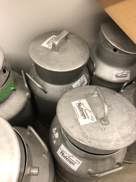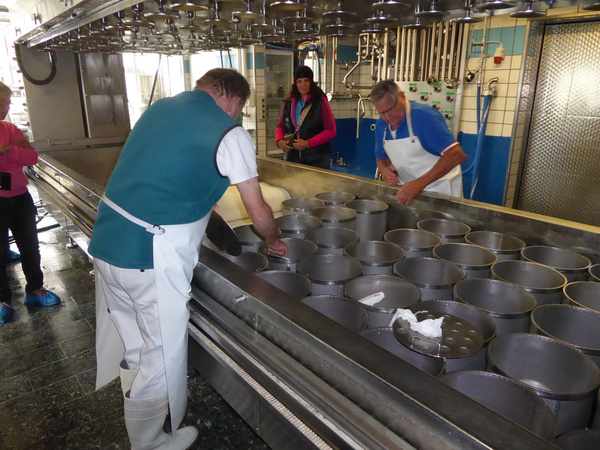 Die Sennerei Nufenen besteht bereits seit 1846. Sie ist eine kleine, aber dennoch moderne Bergkäserei, welche von den rund 22 Milchbauern der Region als Genossenschaft selbst betrieben wird. Die Milchbauern der Sennerei kümmern sich um die Milchproduktion, Qualitätssicherung, Verarbeitung sowie Vermarktung. Christian Simmen, Geschäftsführer der Sennerei, selbst Landwirt und Bürgermeister, führte uns durch die Sennerei und auf die Alpe. Die hochalpine Landwirtschaft auf bis zu 2.300 Höhenmetern ist geprägt vom rauen Klima der Berge und steilen Hänge und fordert sehr viel Arbeitsleistung der Bauern. Ein Roboter ist im modernen Reifelager im Einsatz. Besonders stolz ist die Sennerei auf ihren „Kupfer-Kessl“. Dort wird die eigene Biomilch zu hochapinen Bergkäsespezialitäten verarbeitet.