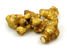 Die Knollen der Topinambur pflanze sind in ihrer Größe mit kleineren Kartoffeln vergleichbar, ähneln ansonsten aber eher der Ingwerknolle.