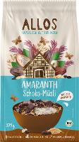HAFERVOLLKORNFLOCKEN*, Amaranthvollkorn* gepoppt (20%), Schokocornflakes* (12%) (Mais* gemahlen, Kakaomasse*, Rohrohrzucker*, Kakaobutter*, Maismalz*, Meersalz, Überzugsmittel: Gummi arabicum*), Zartbitterschokolade* (7%) (Kakaomasse*, Rohrohrzucker*, Kakaobutter*, Kakaopulver* stark entölt), Honig* (6%), SESAM*, Buchweizen*, HASELNÜSSE* geröstet (1%), MANDELN* gehobelt (1%), Palmöl*, Apfelsaftkonzentrat*.| Energie | Fett | gesättigte Fettsäuren | Kohlenhydrate | Zucker | Ballaststoffe | Eiweiss | Salz |