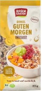 DINKELVOLLKORNFLOCKEN*^ 69%, Sultaninen* 15%, Äpfel* getrocknet, Aprikosen* getrocknet 3,5%, DINKELFLAKES*^ 3%, Sonnenblumenkerne*, rote Johannisbeeren* gefriergetrocknet 1,7%, Reismehl*, Zimt* gemahlen, Sonnenblumenöl*^Dinkel = ein SPELZWEIZEN| Energie | Fett | gesättigte Fettsäuren | Kohlenhydrate | Zucker | Ballaststoffe | Eiweiss | Salz |
