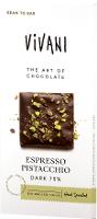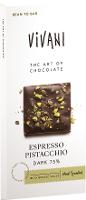 Kakaomasse*, Kokosblütenzucker* 23%, Kakaobutter*, Kakaopulver*, 6% gesalzene, gehackte PISTAZIEN (PISTAZIEN*, Meersalz), Espressopulver* 1,5%. Kakao: 75% mindestens im Schokoladenanteil.| Energie | Fett | gesättigte Fettsäuren | Kohlenhydrate | Zucker | Ballaststoffe | Eiweiss | Salz |