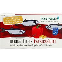 HERINGSFILET (Clupea harengus) (60%), Wasser, Gemüse* in veränderlichen Gewichtsanteilen (10%): Mais*, Paprika*; Sonnenblumenöl*, Tomatenmark*, Rohrohrzucker*, Gewürze*, Branntweinessig*, Verdickungsmittel: Guarkernmehl*; Meersalz.| Energie | Fett | gesättigte Fettsäuren | Kohlenhydrate | Zucker | Ballaststoffe | Eiweiss | Salz |