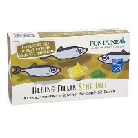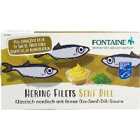 HERINGSFILETS (Clupea harengus) (60%), SENF* (14%) (Wasser, SENFSAATEN*, Branntweinessig*, Meersalz, Gewürze*, Kräuter*), Wasser, Sonnenblumenöl*, Rohrohrzucker*, Branntweinessig*, Honig*, Gewürze*, Meersalz, Verdickungsmittel: Guarkernmehl*; Dillspitzen*.| Energie | Fett | gesättigte Fettsäuren | Kohlenhydrate | Zucker | Ballaststoffe | Eiweiss | Salz |
