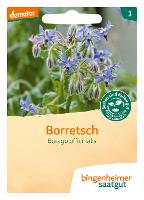 Wunderschön blaublühende Gewürzpflanze und eine ausgezeichnete Bienenweide für Ihren Garten. Borretsch ist leicht zu kultivieren und am passenden Standort sät er sich selbst wieder aus. Der Boden sollte am liebsten feucht und humos sein. Die jungen Blätter sind von feinem Geschmack und bereichern Ihren Salat und Kräuterquark"TIPP": Borretsch-Eiswürfel: Eiswürfelbehälter halb voll mit Wasser füllen und anfrieren lassen. Je eine Borretschblüte dazu geben, mit Wasser auffüllen und einfrieren.