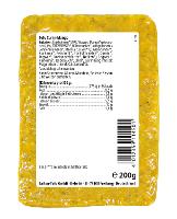 SOJABOHNEN* 59 %, Wasser, Mango* getrocknet 6,1 %, Limettensaft*, Rübenzucker*, kaltgepresstes Sonnenblumenöl*, Meersalz, Curry* 1,0 % (Koriander*, Kurkuma*, Reismehl*, Bockshornklee*, Cumin*, Ingwer*, Korianderblätter*, Nelken*), Ingwer*, Kurkuma*, Knoblauch*, Chili*, Gerinnungsmittel: Magnesiumchlorid, Calciumsulfat.| Energie | Fett | gesättigte Fettsäuren | Kohlenhydrate | Zucker | Eiweiss | Salz |