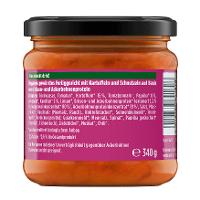Trinkwasser, Tomaten*, Kartoffeln* 15%, Tomatenmark*, Paprika* 8%, Zwiebeln*, Karotten* 5%, Linsen*, Erbsen- und Ackerbohnenprotein* texturiert 3,2 % (Erbsenproteinkonzentrat* 80%¹) , Ackerbohnenproteinkonzentrat* 19%²), Salz), Maisstärke*, Rauchsalz (Meersalz, Rauch), Rohrrohrzucker*, Sonnenblumenöl*, Knoblauch*, Verdickungsmittel:Guarkernmehl*; Meersalz, Spinat*, Paprika geräuchert* (getrocknetePaprika*, Eichenrauch), Liebstöckel*, Muskat*, Chili*.