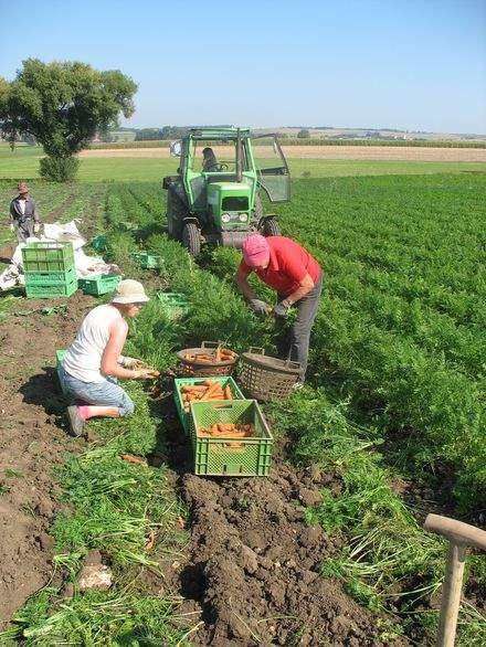 Unser Bioland-Hof liegt in Maihingen im Nördlinger Ries, malerische Städtchen und die weite Landschaft laden zum Wandern und Radfahren ein. Die fruchtbaren Ackerböden ermöglichen eine vielfältige Landwirtschaft. 1986 begannen wir mit dem biologischen Landbau auf unseren Flächen. Neben Brot- und Futtergetreide bauen wir viel Feldgemüse an. Das sind Gelbe Rüben, Rote Rüben, Zwiebeln, Lauch, verschiedene Kohlsorten, Zucchini, Kürbisse, Feldgurken und anderes Gemüse sowie Zuckerrüben zur Herstellung von Bio-Zucker. Es gibt eine große Obstplantage mit Apfel- und Birnbäumen, Himbeer-, Johannisbeer- und Heidelbeersträuchern.