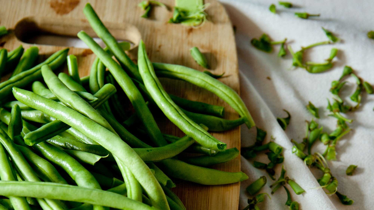 Nun das stark gesalzene Wasser zum Kochen bringen und währenddessen die Bohnen putzen. Die Bohnen 4 bis 5 Minuten sprudelnd kochen, sodass sie noch Biss haben. Nun abgießen und sofort im Topf mit eiskaltem Wasser abschrecken und in einem Sieb abtropfen lassen.