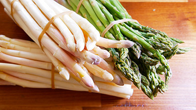 Senf mit Weißweinessig, Öl, Salz und Pfeffer verrühren. Spargel schälen und die holzigen Enden abschneiden. Von den Frühlingszwiebeln vier lange Blätter lösen und kurz durch kochendes Wasser ziehen. Den Rest in Ringe schneiden.