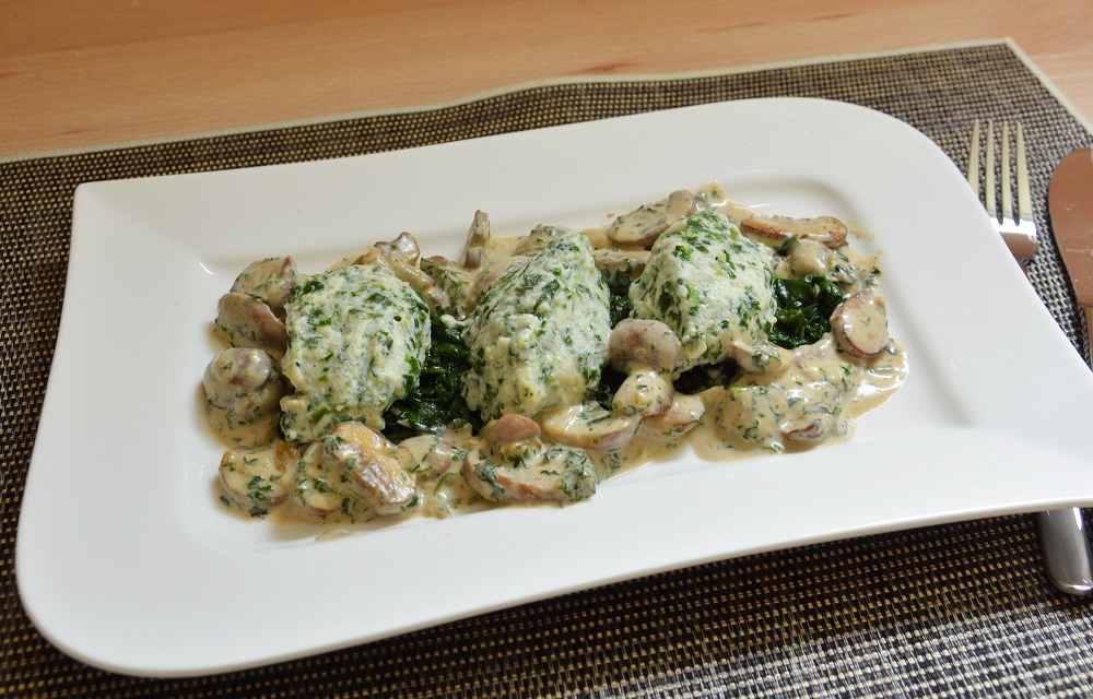Spinat-Crème fraîche-Knödel mit Champignonsauce
