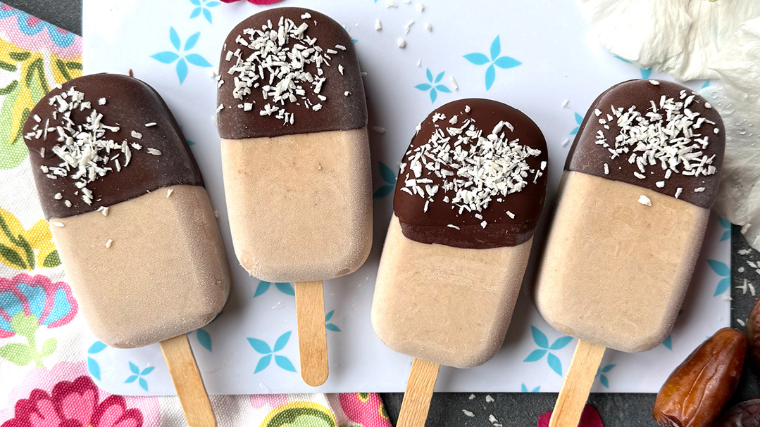 Gefrorenes Eis aus der Form lösen, in die Schokolade tauchen, kurz abtropfen lassen und sofort mit Kokosstreuseln bestreuen.