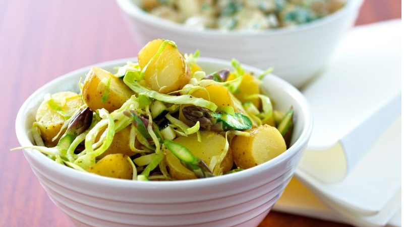 Die Kartoffeln pellen, in Würfel schneiden und mit der Salatsauce mischen.