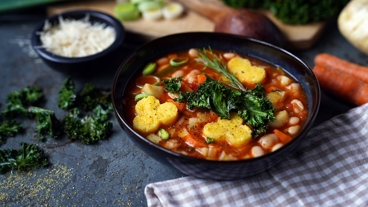 Minestrone mit Polenta, Grünkohl-Chips und geriebenem Parmesan servieren.