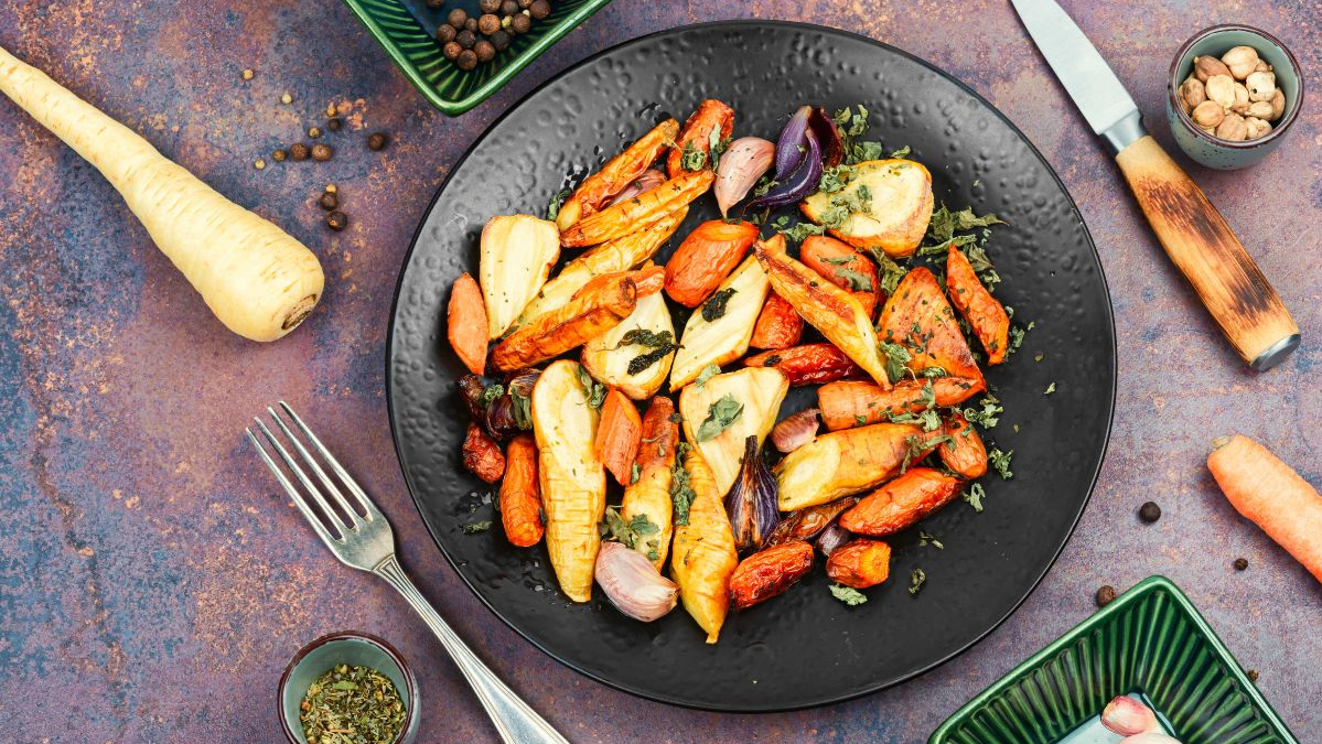 1. Den Ofen auf 180°C Umluft vorheizen. Die Zwiebeln schälen, Karotten und Topinambur mit einer Gemüsebürste unter kaltem Wasser abschrubben. Den Kürbis aushöhlen und in Spalten schneiden, die Zwiebeln längs in Spalten achteln. Karotten und Topinambur in mundgerechte Stücke schneiden. Die Knoblauchzehe quer halbieren.