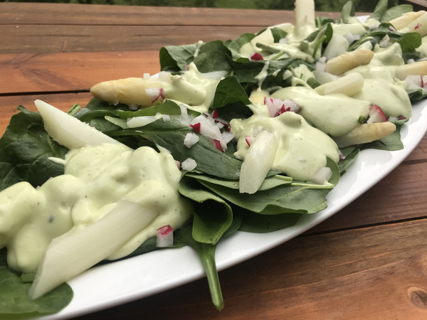 Spargel schälen. Einen Topf mit Wasser zum Kochen bringen, etwas Salz, Zucker und Zitronensaft zugeben und den Spargel in das Wasser geben. Einmal aufkochen lassen und den Spargel bei ausgeschalteter Herdplatte in ca. 15 Minuten garziehen lassen. (Er sollte noch etwas „Biss“ haben). In der Zwischenzeit den Babyspinat waschen und trockenschleudern. Die Radieschen putzen und fein hacken. Das Fruchtfleisch aus der Avocado lösen, zusammen mit Joghurt, Mayo und Zitronensaft pürieren. Ca. 2 Kellen von dem Spargelwasser zugeben und mit Salz und Pfeffer abschmecken. Den Spargel mit einer Schaumkelle aus dem Kochwasser heben und gut abtropfen lassen, dann die Spargelstangen jeweils dritteln und auf dem Spinat anrichten. Den Salat mit den Radieschen bestreuen und das Dressing darüber geben.